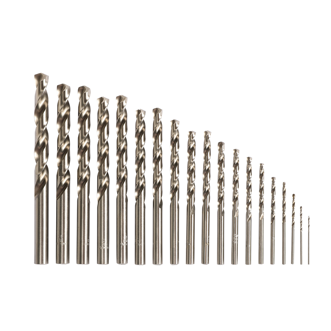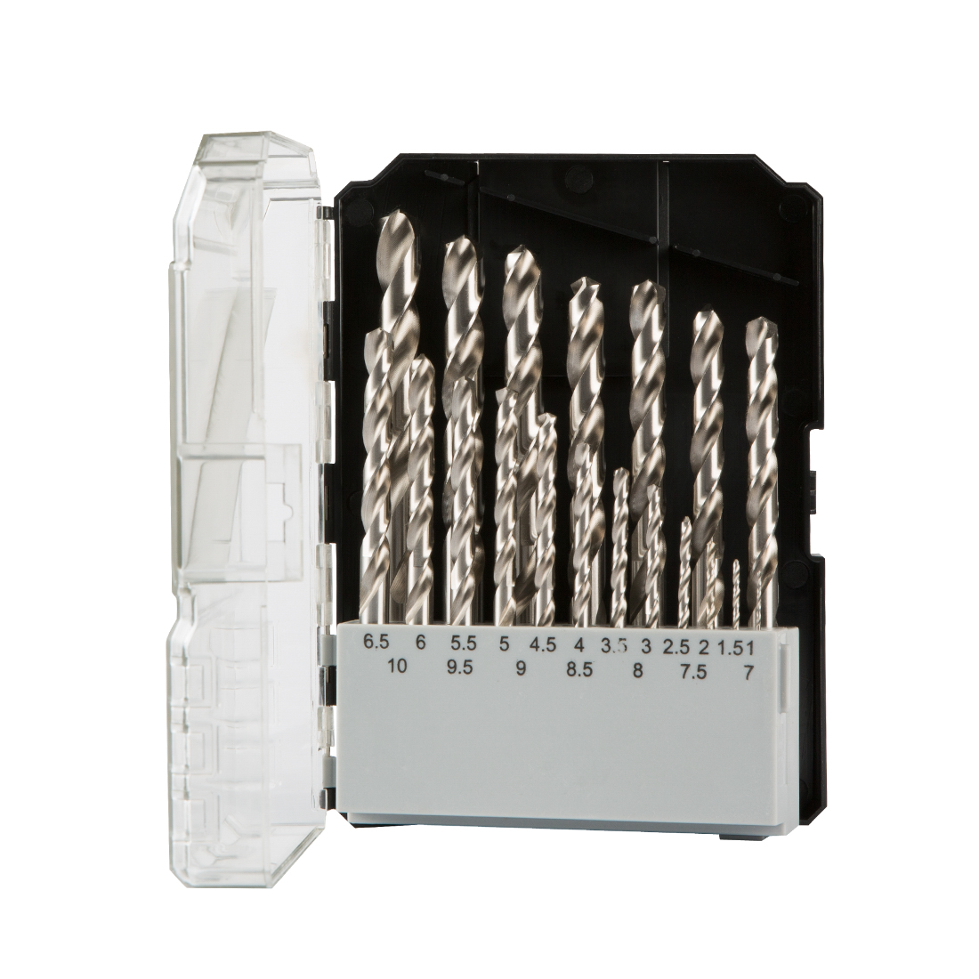 Kendo HSS hurtigstålbor i 19 deler. Størrelse: Ø1-1.5-2-2.5-3-3.5-4-4.5-5-5.5-6-6.5-7-7.5-8-8.5-9-9.5-10mm.