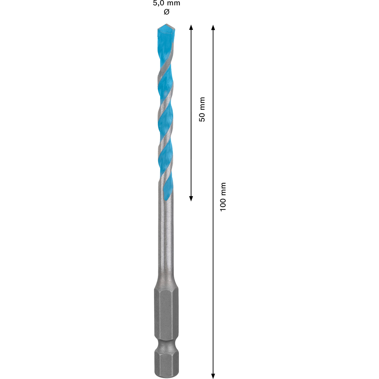 Diameter: 5 mmArbeidslengde: 50 mmTotal lengde: 100 mmSkafttype: SekskantSkaftstørrelse: 1/4"Bruksområde: Multikonstruksjon (tre, metall, plast, mur, fliser m.m.)