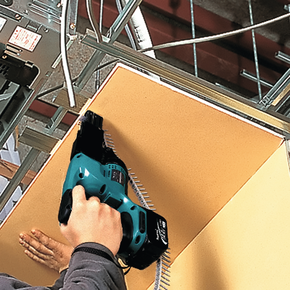 Makita DFR450 er en batteridrevet skruautomatmaskin med 18 volt for montering av gipsplater og andre plater, med skruer på bånd. Fra 25mm til 41mm skruer. Bruker 127mm bits. Her får du fordeler som trinnløs dybdejustering, redusert tomgangslyd, beltekrok, og batteribeskyttelse som skåner batteriet mot overbelastning. Kan benyttes med en gulvforlenger, 194500-1.