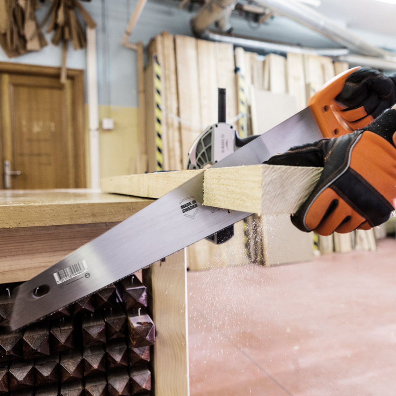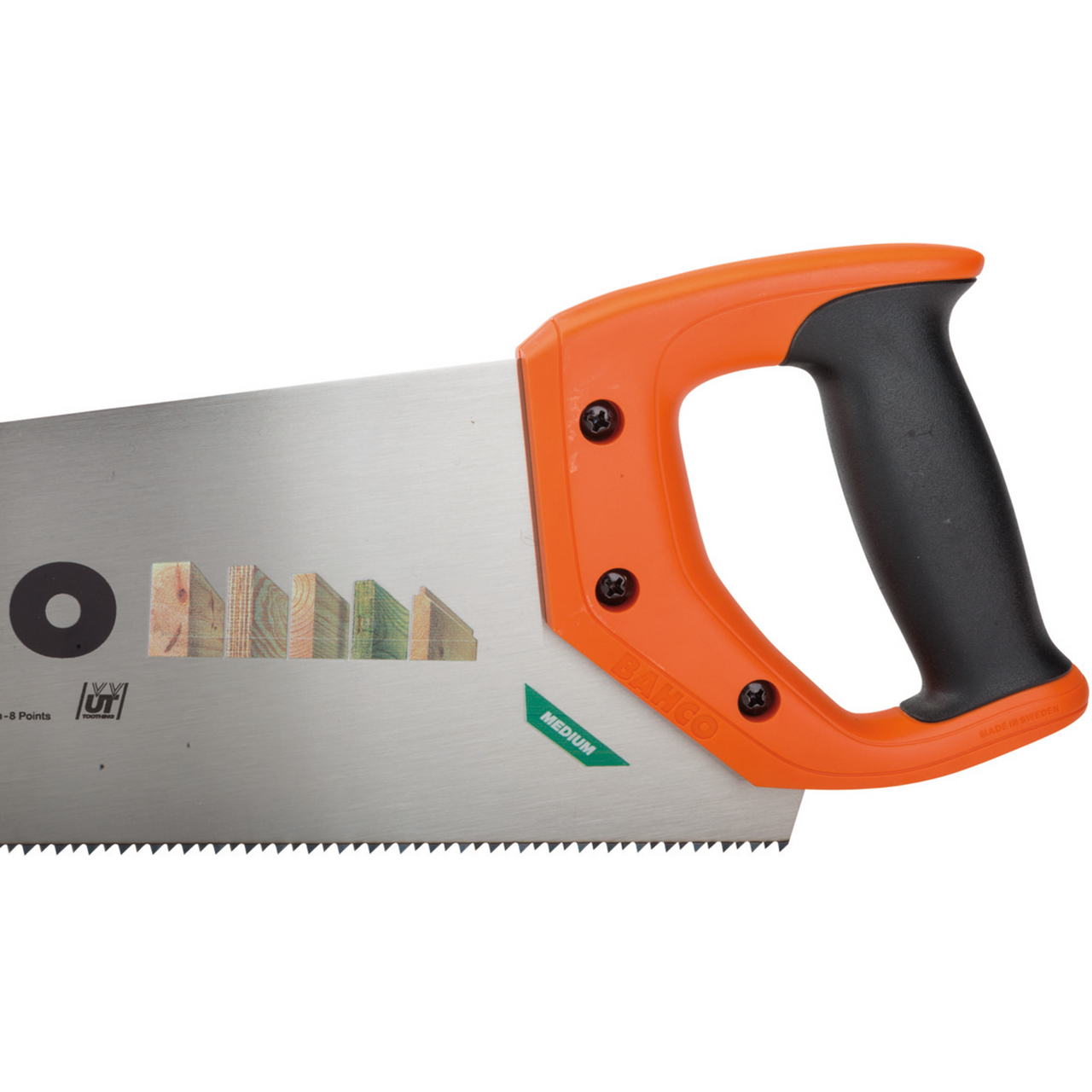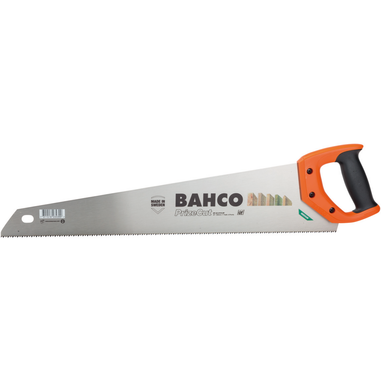 Håndsag for kapping av alle typer trematerialer. Universaltanning som er tannspissherdet for å holde skarpheten lenger. Håndtak med et komfortabelt grep og god støtte. Skrudd 2-komponents håndtak med 45° og 90°. Blad lengde er 550mm, 7/8 tenner pr tomme(medium tanning)