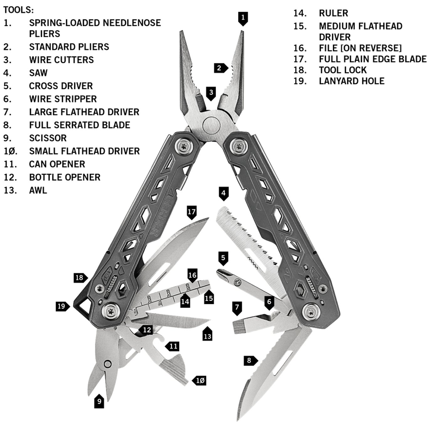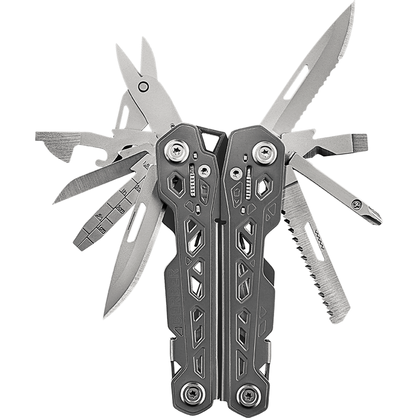 Dette multiverktøyet fra Gerber har 17 verktøy, og alle verktøyene er utenpåliggende og låsbare. I tillegg har den en fjærbelastet tang.