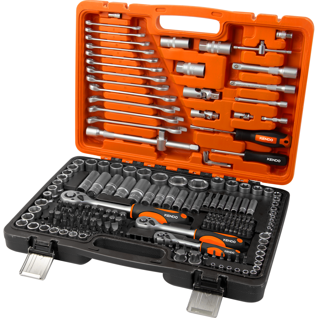 Dette allsidige pipenøkkelsettet fra Kendo inneholder 216 deler. Det inkluderer piper, bits, kombinasjonsnøkler, unbrakonøkler, skrallehåndtak og tilbehør.