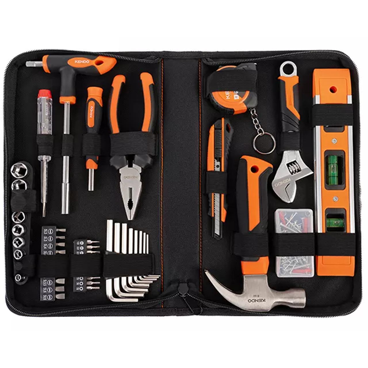 Antall deler: 131Håndverktøy: tang, hammer, skiftenøkkel, brytekniv, vaterSkrutrekking: bits, presisjonshåndtak, T-håndtakPiper & nøkler: 1/4" piper (5–13 mm), unbrakonøkler (1,5–6 mm)Måling og test: målebånd, spenningstesterTilbehør: spikersortimentLeverandørens varenummer90628