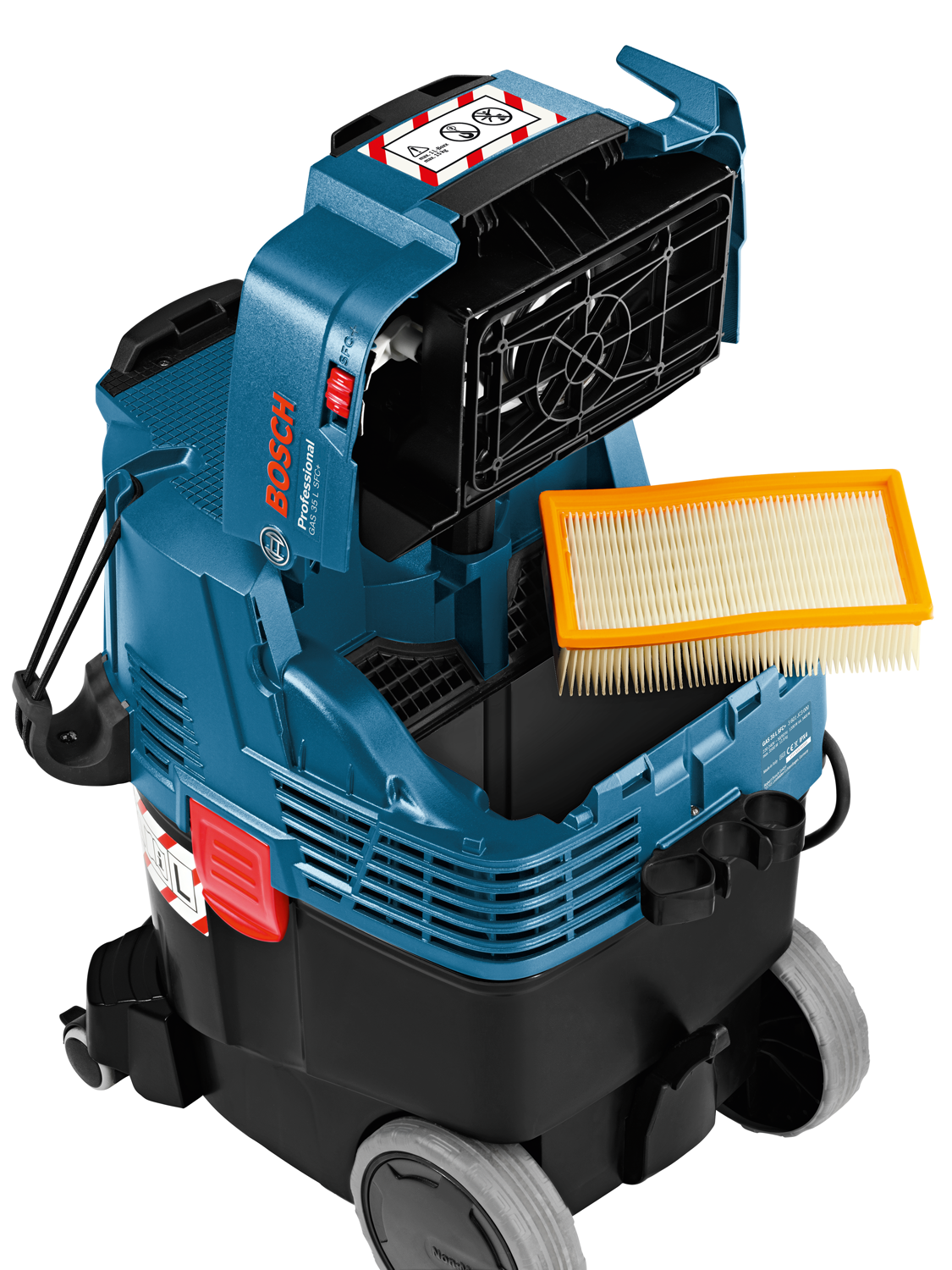 Denne mobile støvsugeren fra Bosch er en våt- og tørrsuger med halvautomatisk filterrengjøring, noe som gir mulighet til rask og enkel filterengjøring med én hånd.