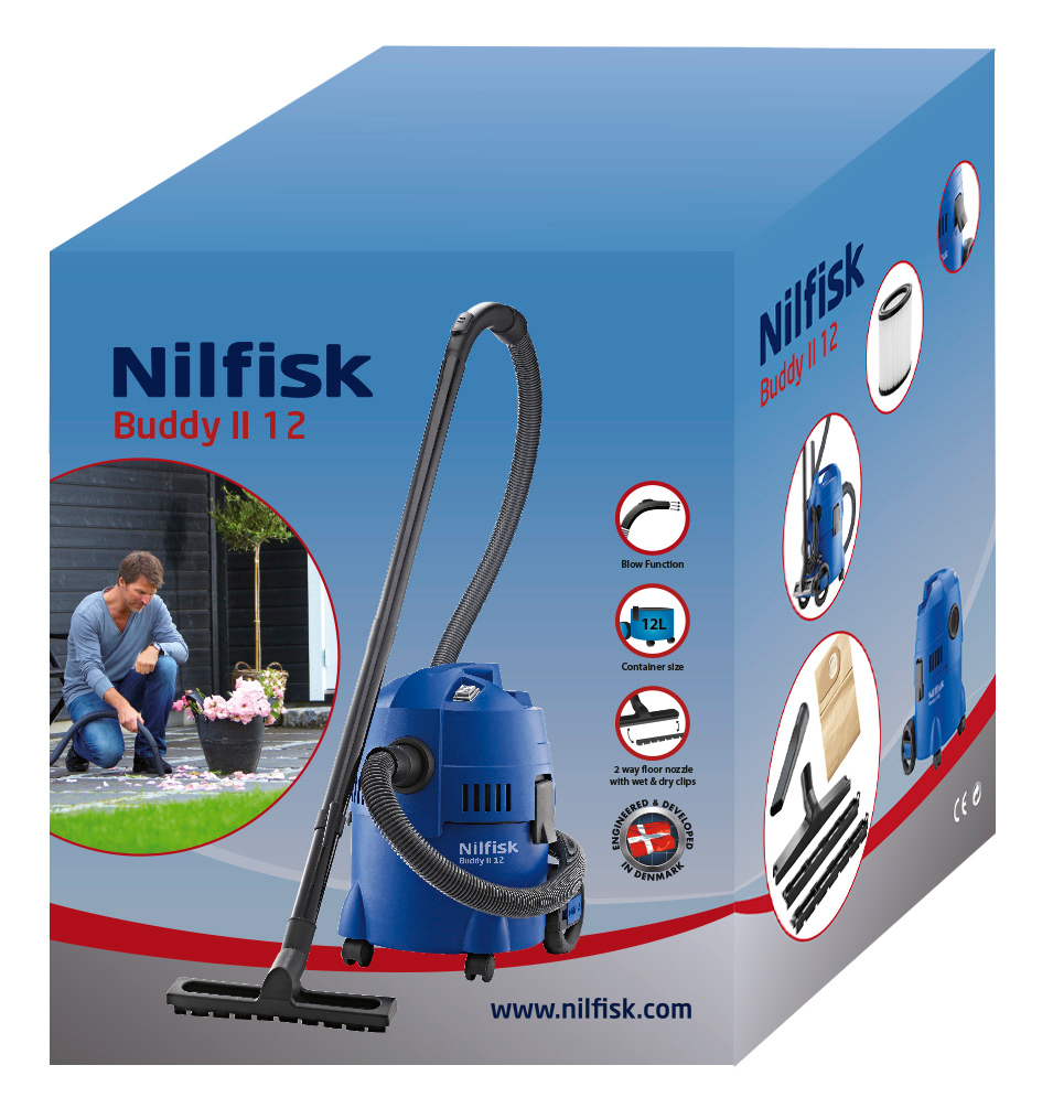 Nilfisk Buddy II 12 er en liten, lett, men kraftig hjelper til å suge opp våt og tørr rusk til ditt hjem, bil, verksted, hobbyer og til og med for utvendig rengjøring. Denne modellen har 12-liters beholder og er utstyrt med fleece filterposesystem som kan benyttes selv til fuktig skitt. Fleece støvsugerpose system: Mulighet for oppsug av fuktig skitt uten å ødlegge filterposen. Støv-/våtfilter beskytter motor: Lengre levetid