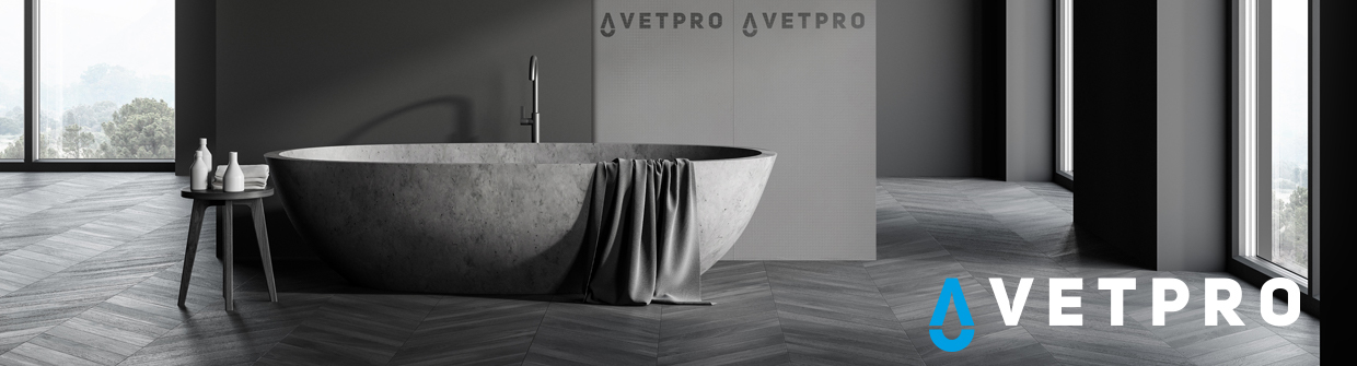 Vetpro våtromssystem er et komplett Sintef-godkjent system for ditt nye bad. Platene fra Vetpro kan brukes uansett om du har stenderverk, plater eller mur som underlag og de er ideelle hvis du skal kle de med fliser. Monteringen er enkel, platene gir god isolasjon og ikke minst muligheten til å enkelt bygge konstruksjoner som f.eks. baderomsbenker, dusjnisjer, sisternekasser etc. Vetpro gir deg et bad som er mugg- og råtesikkert, og 100% vanntett så fremst monteringen gjøres i henhold til produsentenes anvisninger.