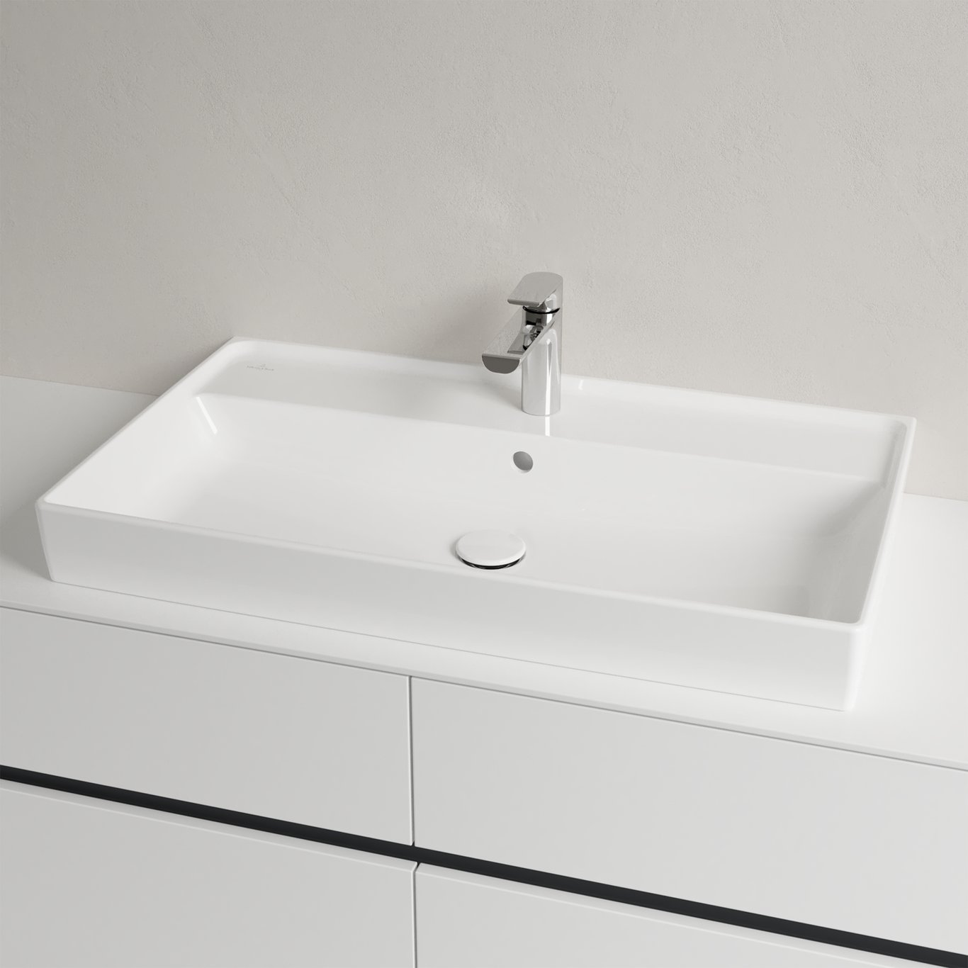 Denne stilrene servanten fra Villeroy & Boch har tynne og rette kanter, med en stilig karakteristisk kant som også passer på så det ikke spruter vann utover hele benken.