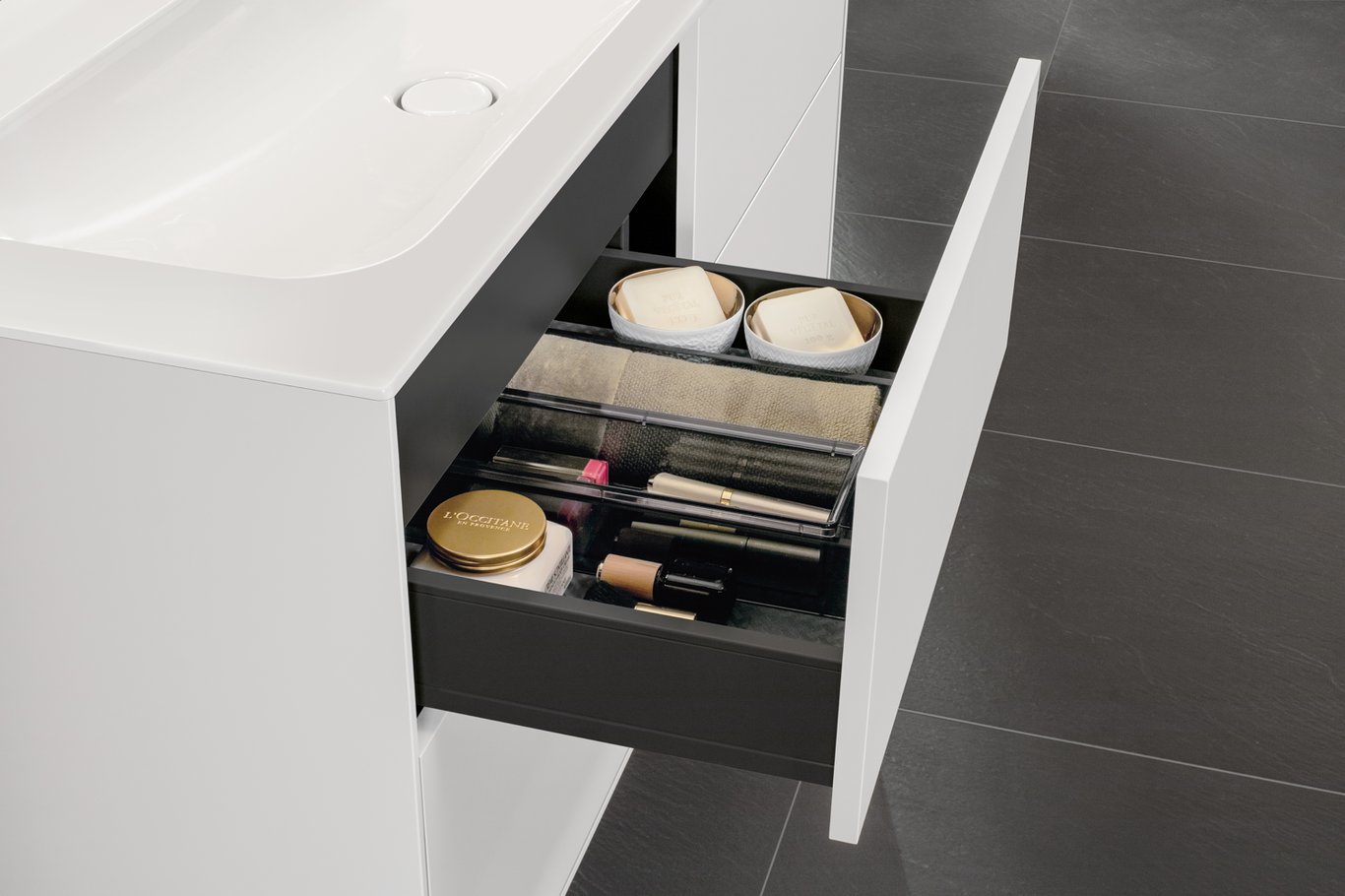 Den malte overflaten er svært ripebestandig, og skuffene har godt med oppbevaringsplass og kommer med flere smarte oppbevaringsløsninger, som skillevegger og oppbevaringsbokser til tilbehør.