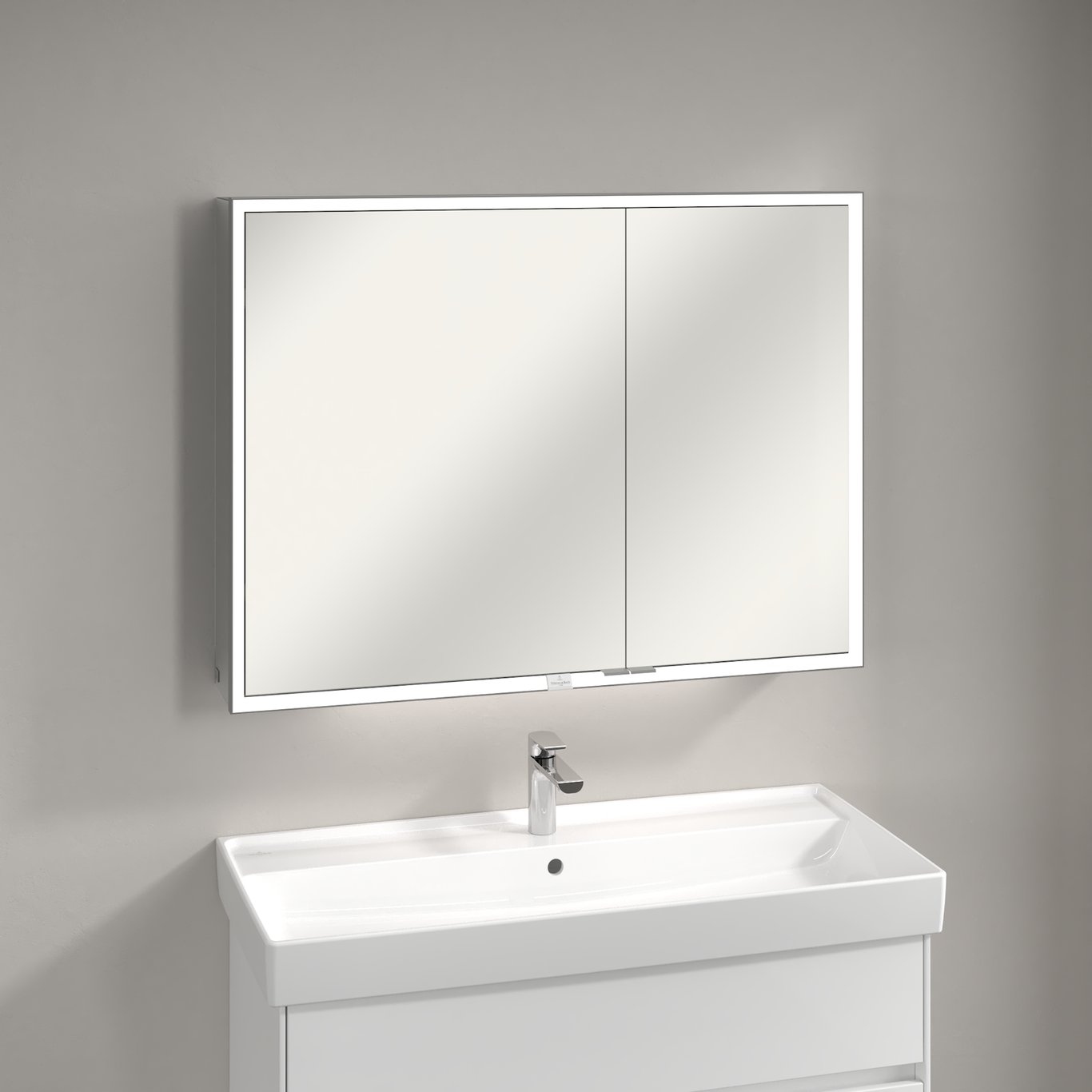 Dette speilskapet fra Villeroy & Boch har integrert LED-lys, og et smart system for oppbevaring av baderomsartikler.