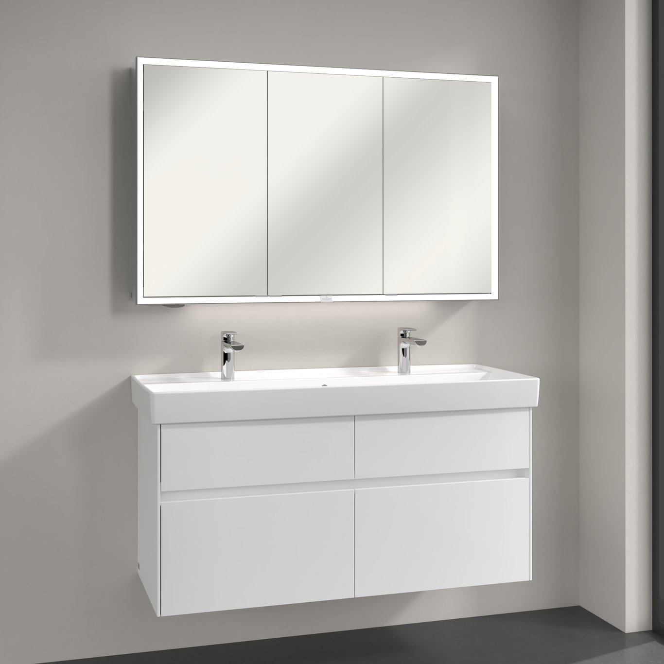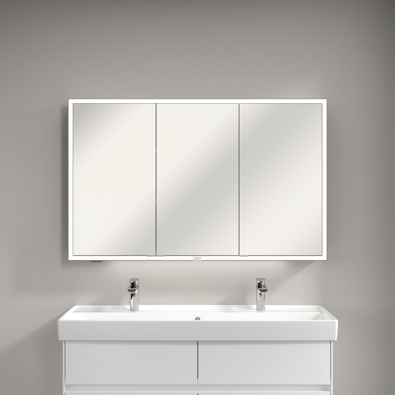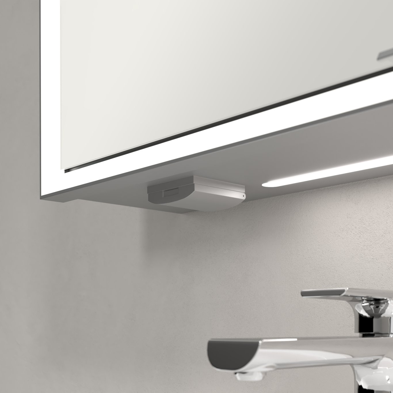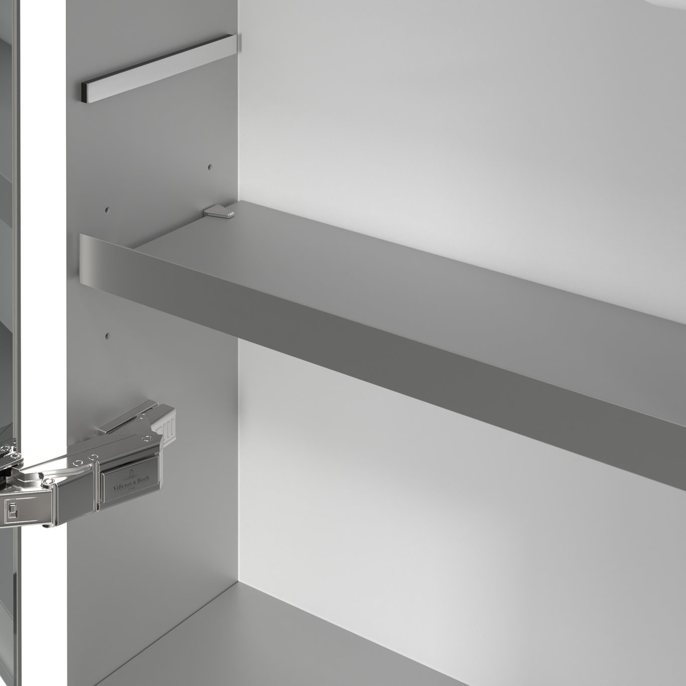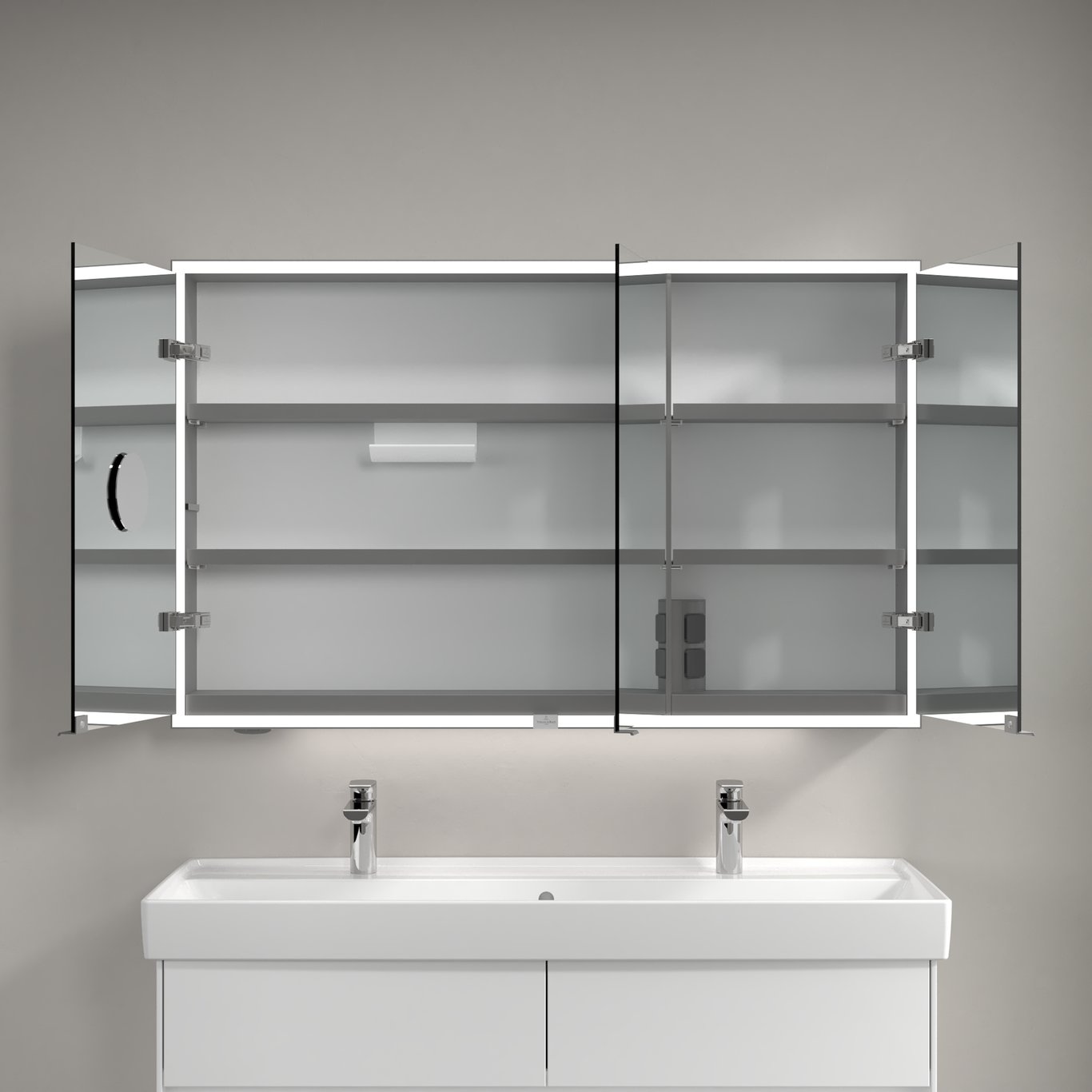 Dette speilskapet fra Villeroy & Boch har integrert LED-lys, og et smart system for oppbevaring av baderomsartikler.
