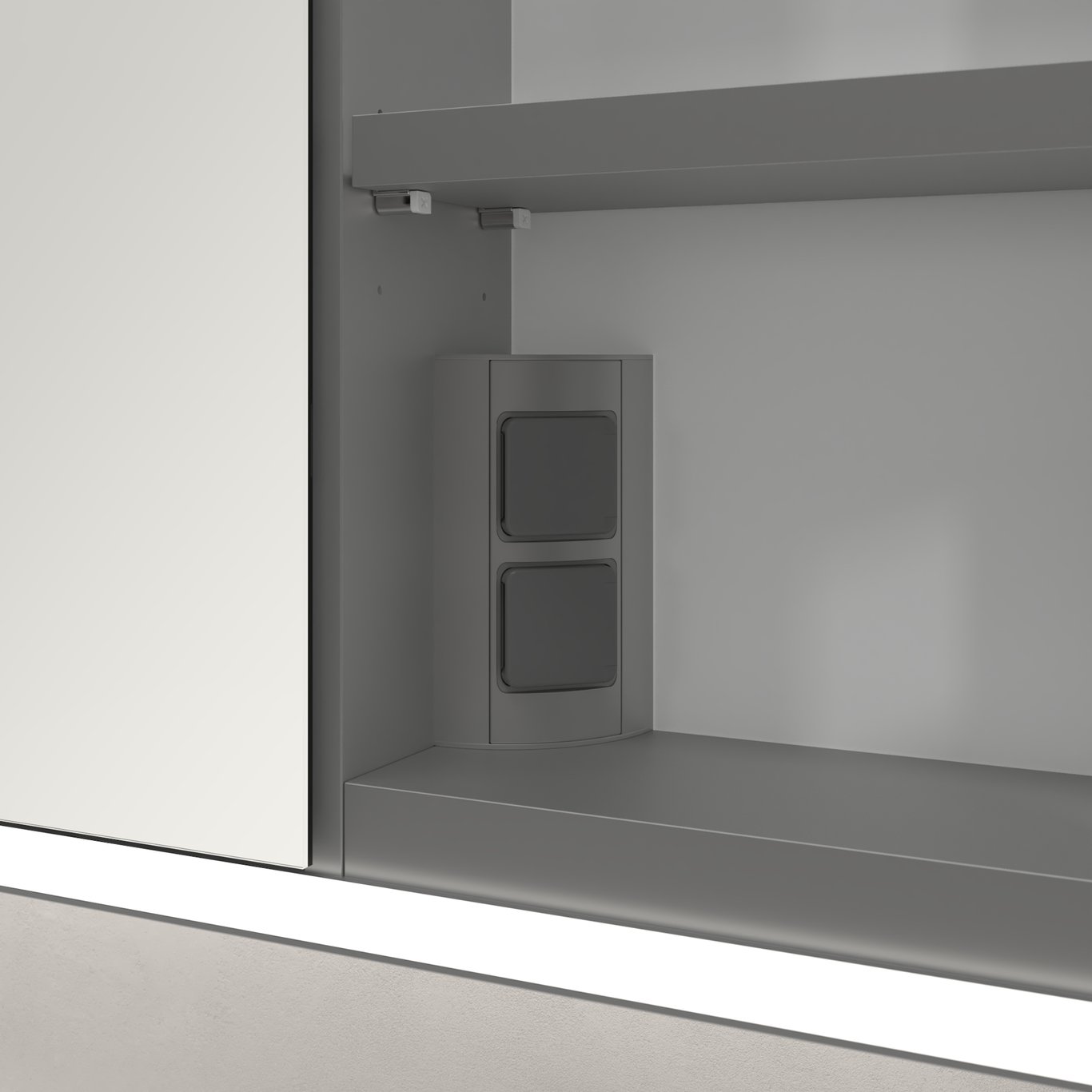 Skapet har et smart system for oppbevaring som består av hyller, en magnetstripe for enkel oppheng av for eksempel pinsett og neglesaks, og stikkontakter, og et mindre forstørrelsesspeil.