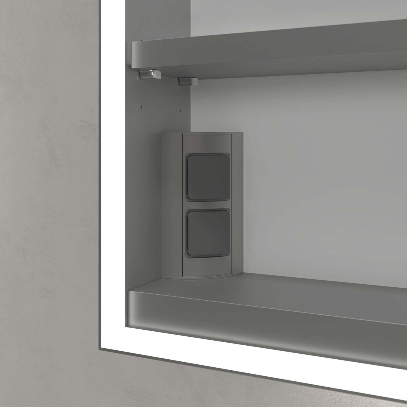 - Følger med: 1 x dør 1 x På/Av-bryter på utsiden 2 x stikkontakt på innsiden (venstre) 1 x stikkontakt på utsiden (høyre) 2 x aluminiumshyller 1 x oppbevaringsskål 1 x forstørrelsesspeil 1 x magnetlist