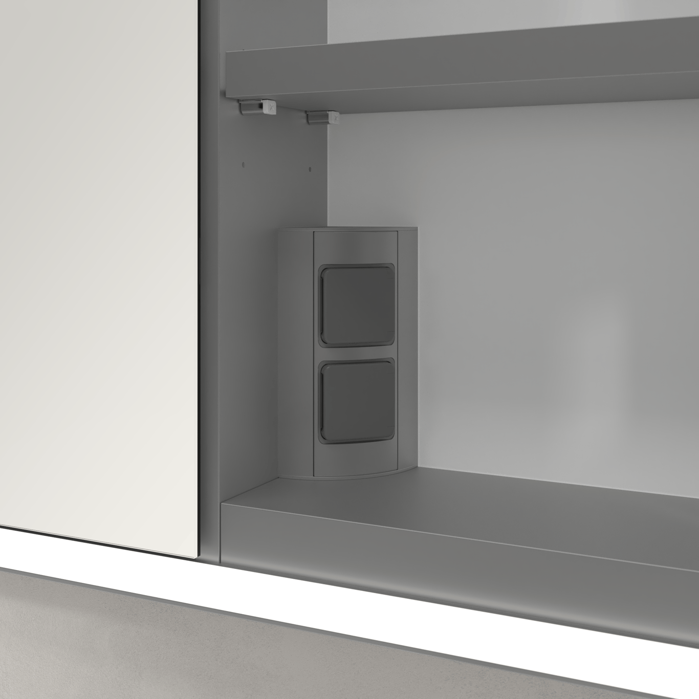 Skapet har et smart system for oppbevaring som består av hyller, en magnetstripe for enkel oppheng av for eksempel pinsett og neglesaks, og stikkontakter, og et mindre forstørrelsesspeil.