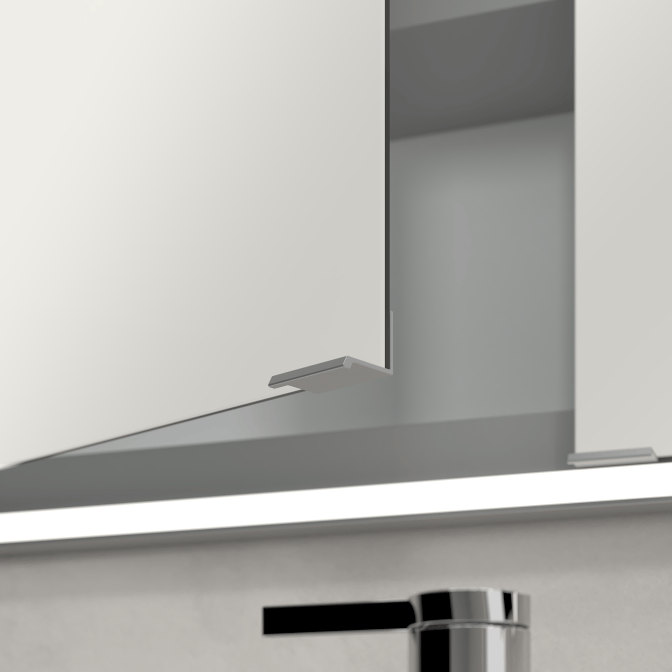 Skapet har et smart system for oppbevaring som består av hyller, en magnetstripe for enkel oppheng av for eksempel pinsett og neglesaks, og stikkontakter, og et mindre forstørrelsesspeil.