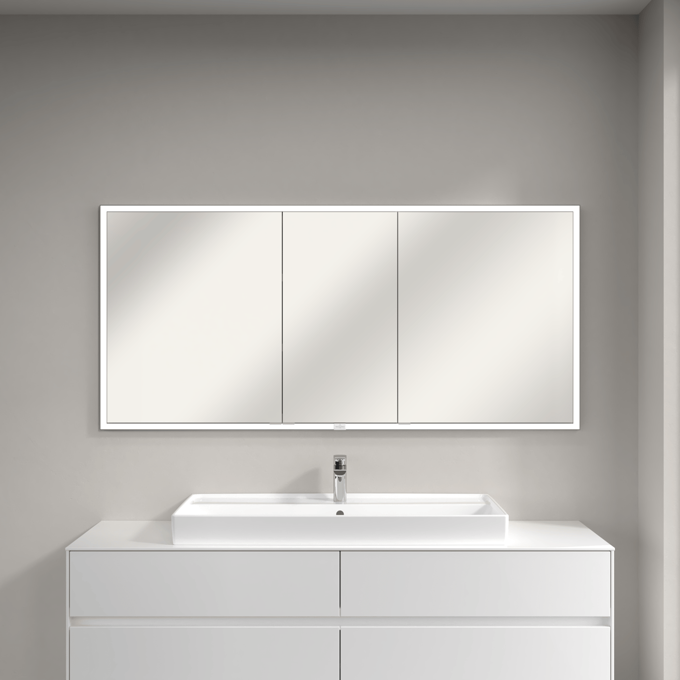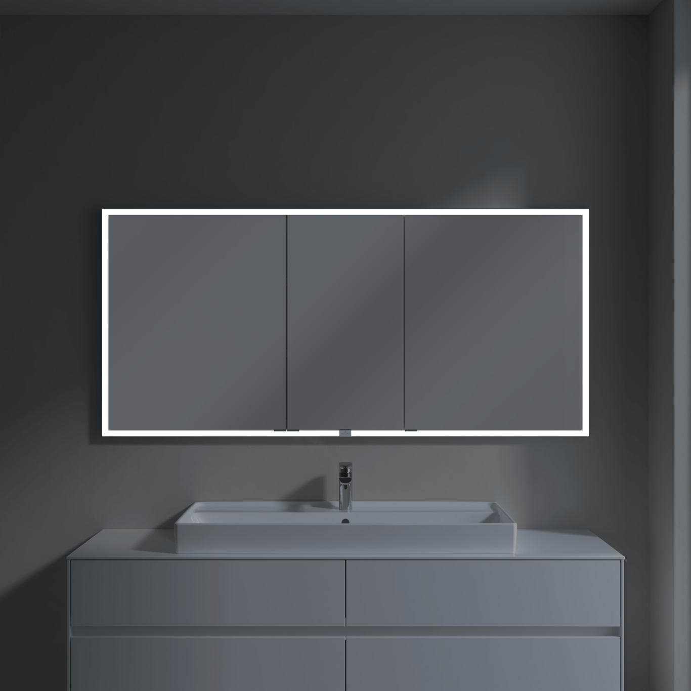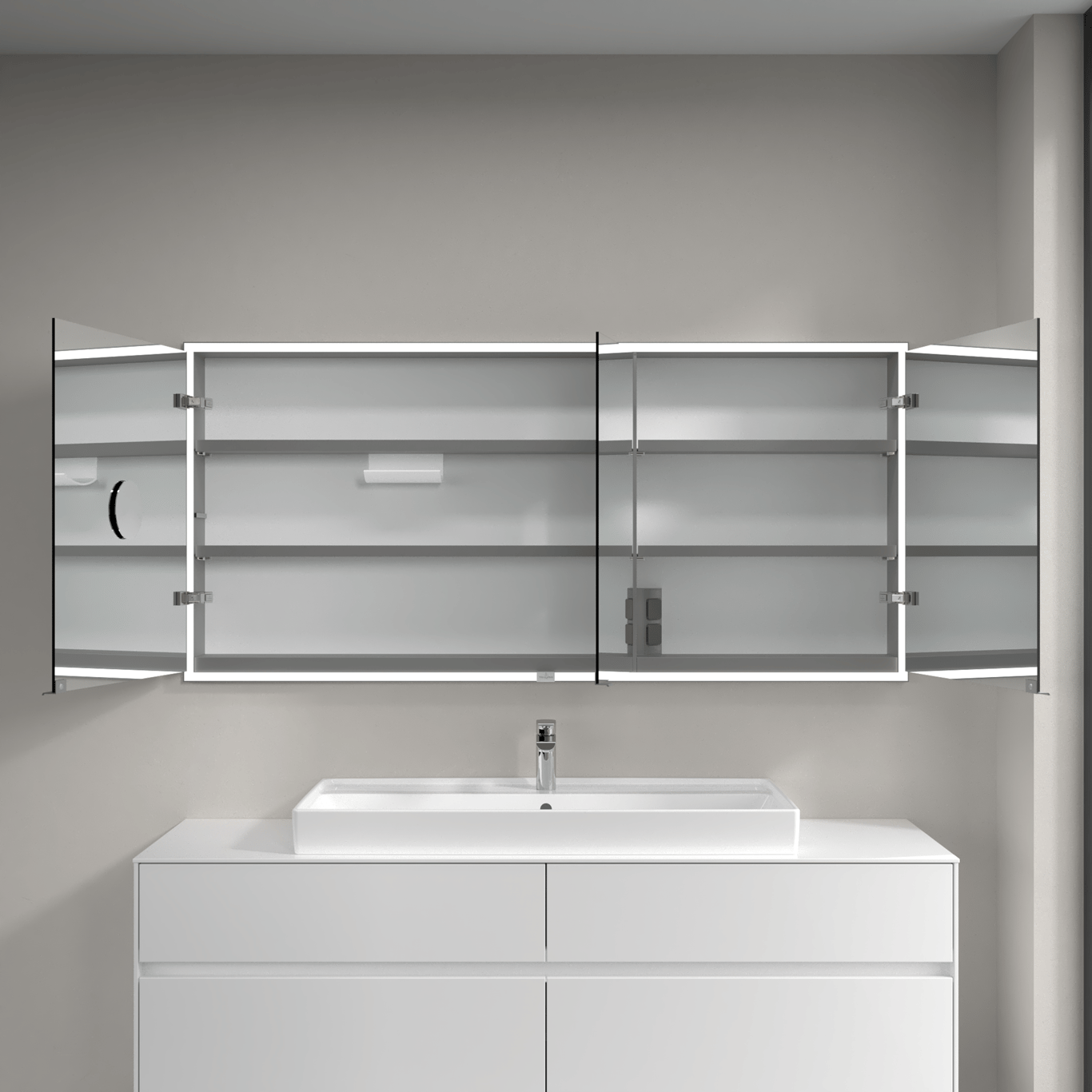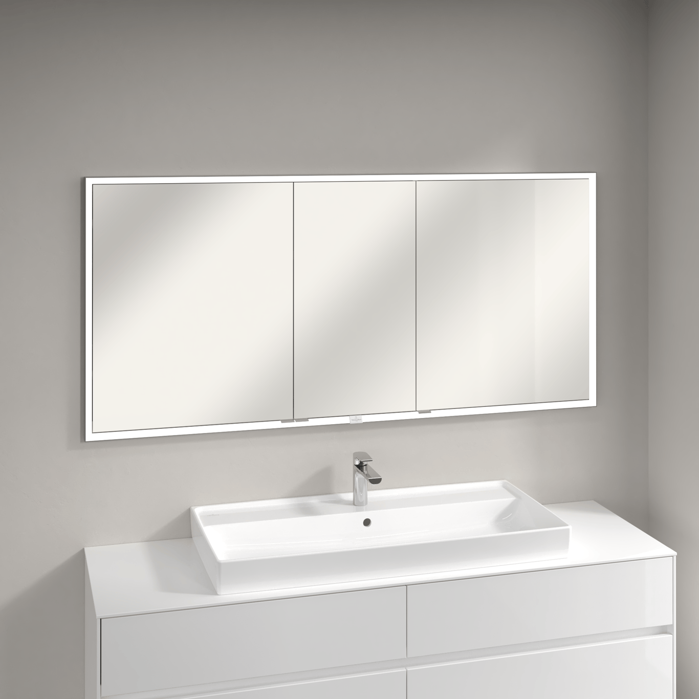 Dette speilskapet fra Villeroy & Boch er laget for å bygges inn i veggen og har integrert LED-lys, og et smart system for oppbevaring av baderomsartikler.