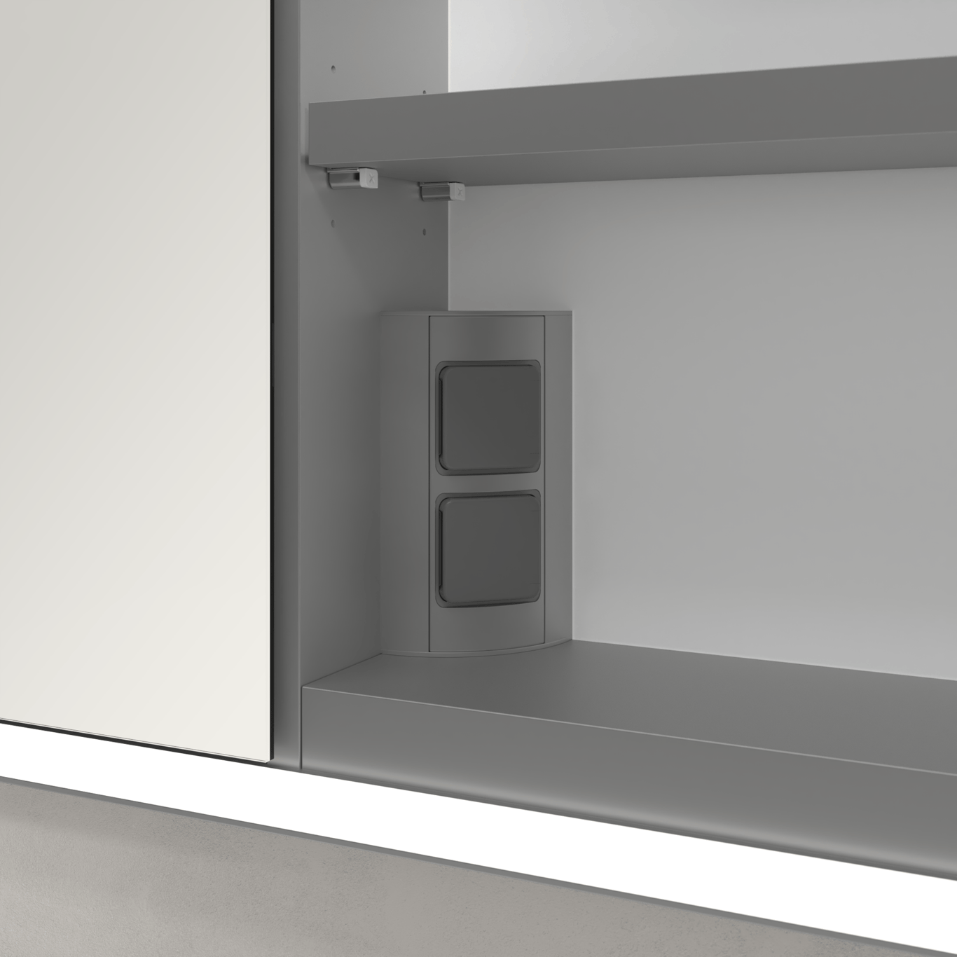Skapet har et smart system for oppbevaring som består av hyller, en magnetstripe for enkel oppheng av for eksempel pinsett og neglesaks, og stikkontakter, og et mindre forstørrelsesspeil.