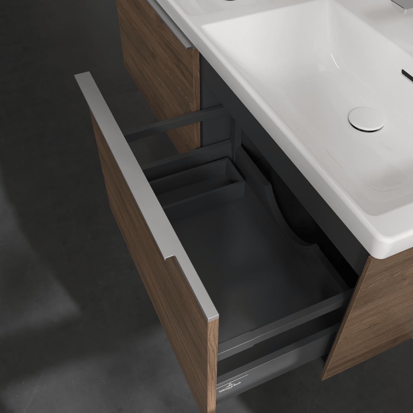 Servantskapet har skuffer med god oppbevaringsplass, og en soft close- og self close-funksjon som sørger for myk lukking, selv når skuffene blir smelt igjen.