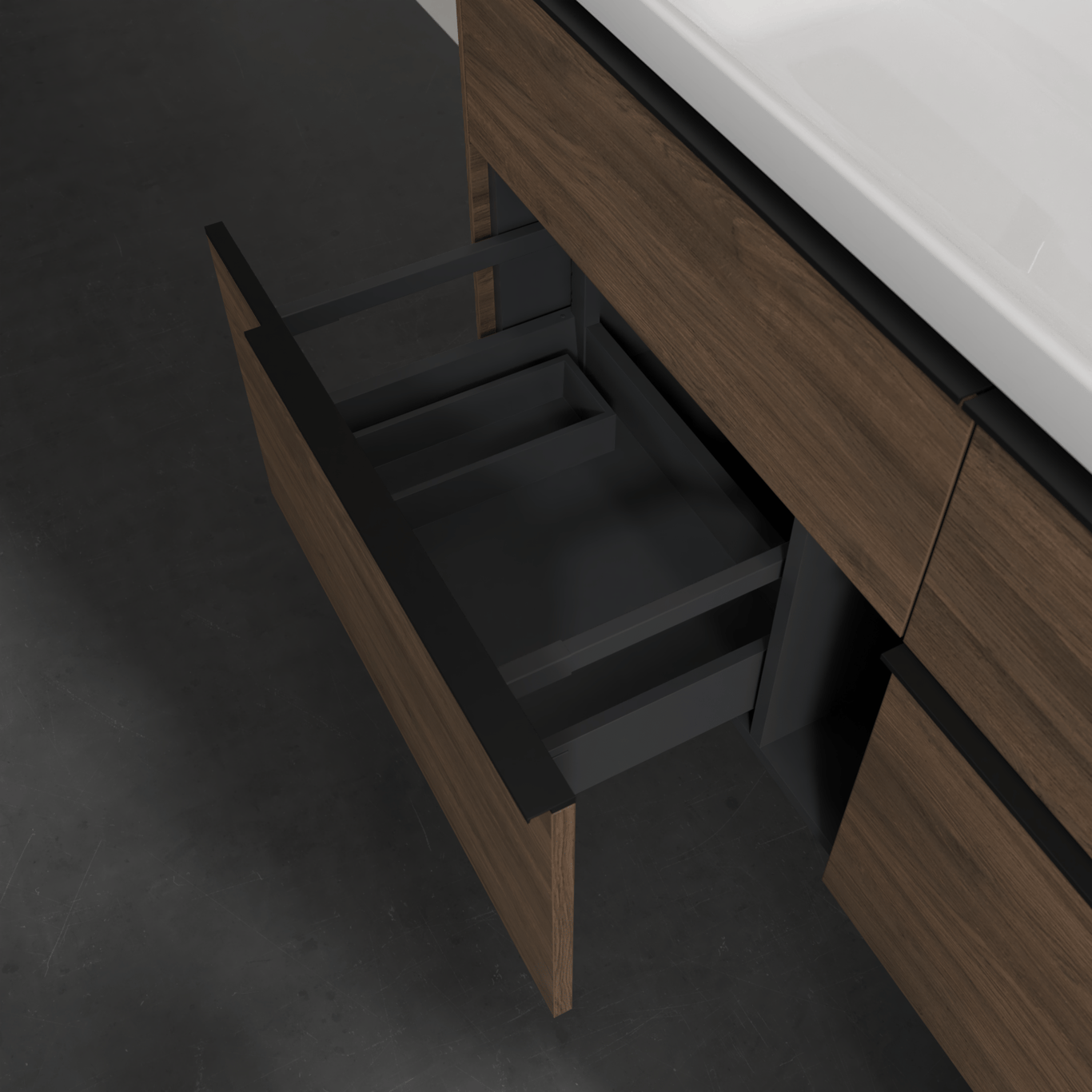 Servantskapet har skuffer med god oppbevaringsplass, og en soft close- og self close-funksjon som sørger for myk lukking, selv når skuffene blir smelt igjen.