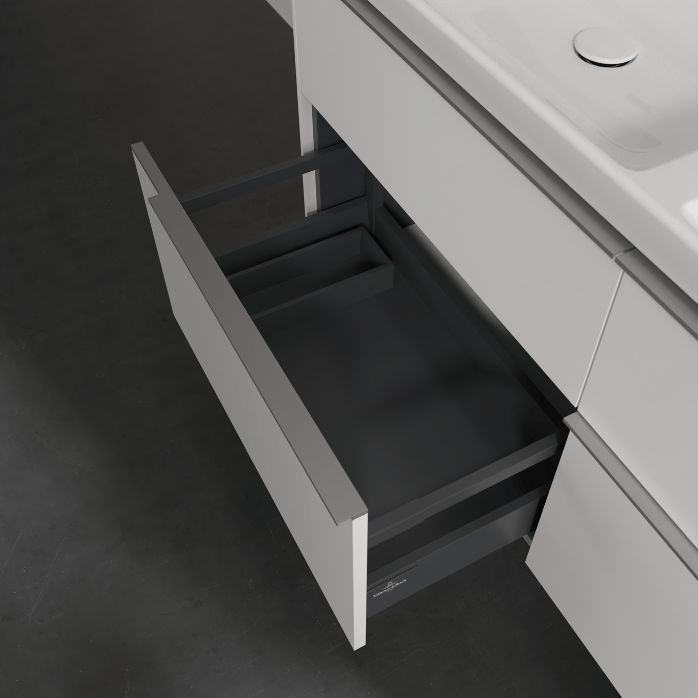 Servantskapet har belyste skuffer med god oppbevaringsplass, og en soft close- og self close-funksjon som sørger for myk lukking, selv når skuffene blir smelt igjen. LED-lyset i skuffen har integrert bevegelsessensor så den automatisk skrur seg på og av når skuffen åpnes og lukkes.
