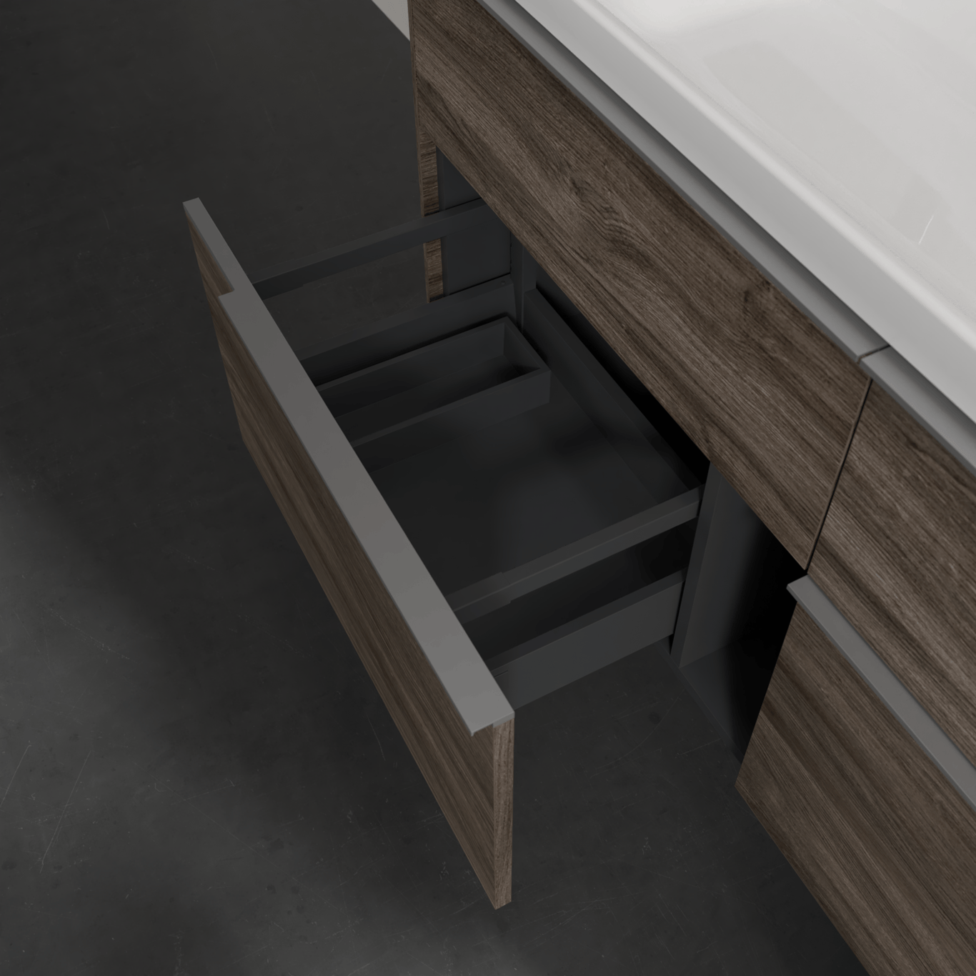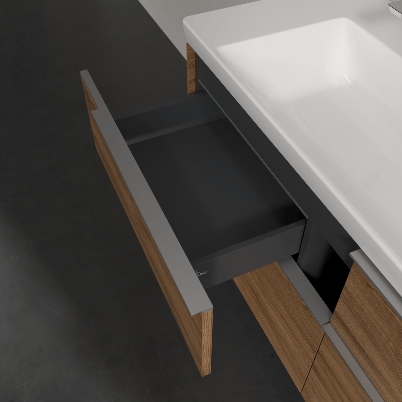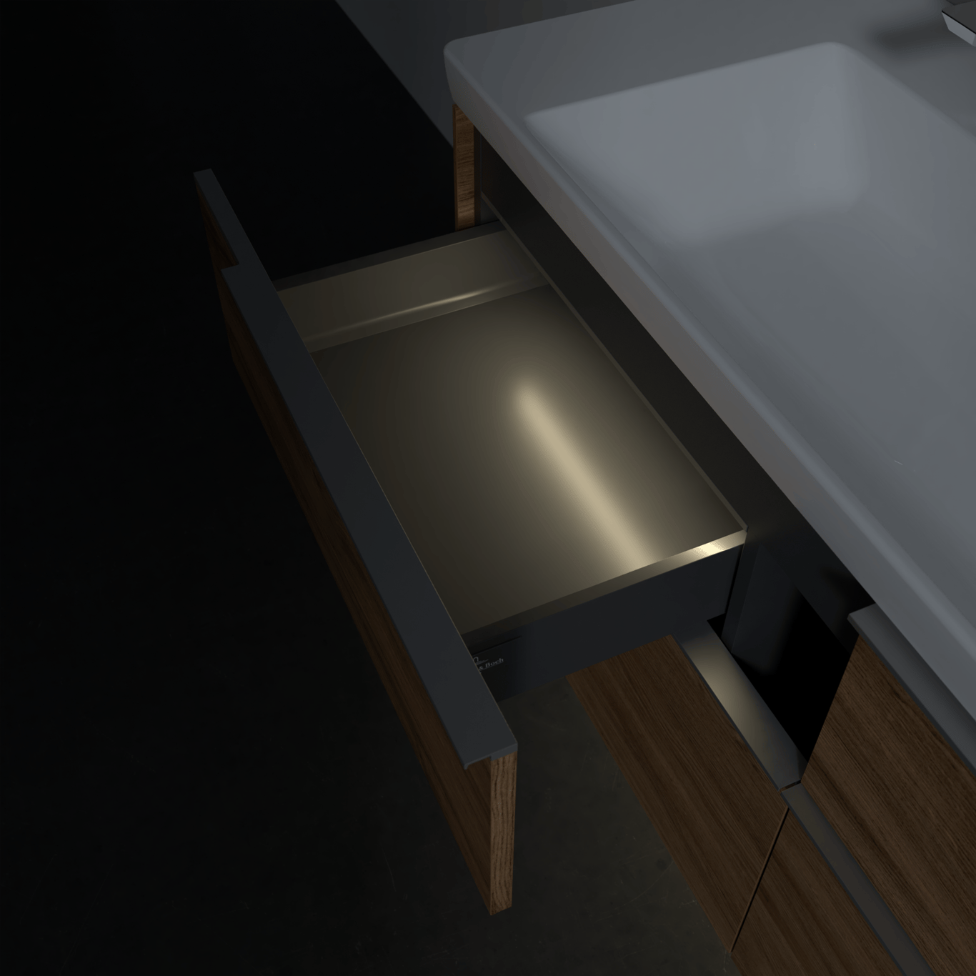 Servantskapet har belyste skuffer med god oppbevaringsplass, og en soft close- og self close-funksjon som sørger for myk lukking, selv når skuffene blir smelt igjen. LED-lyset i skuffen har integrert bevegelsessensor så den automatisk skrur seg på og av når skuffen åpnes og lukkes.