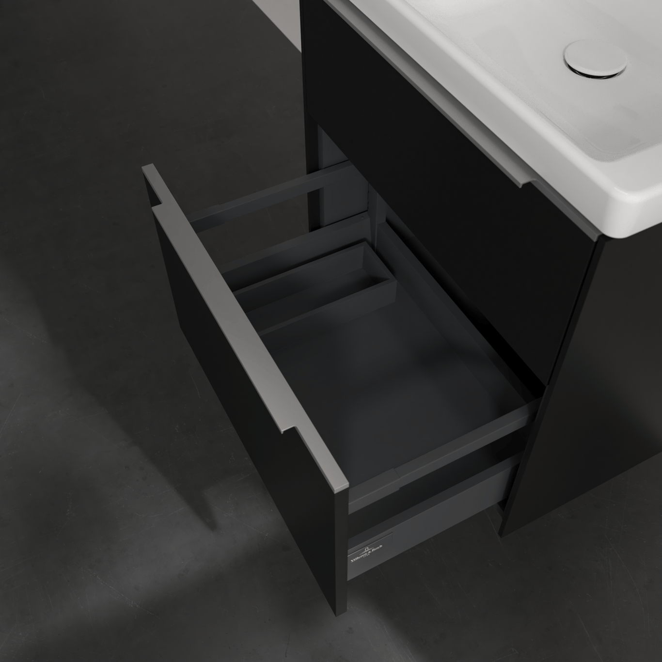 Servantskapet har belyste skuffer med god oppbevaringsplass, og en soft close- og self close-funksjon som sørger for myk lukking, selv når skuffene blir smelt igjen. LED-lyset i skuffen har integrert bevegelsessensor så den automatisk skrur seg på og av når skuffen åpnes og lukkes.
