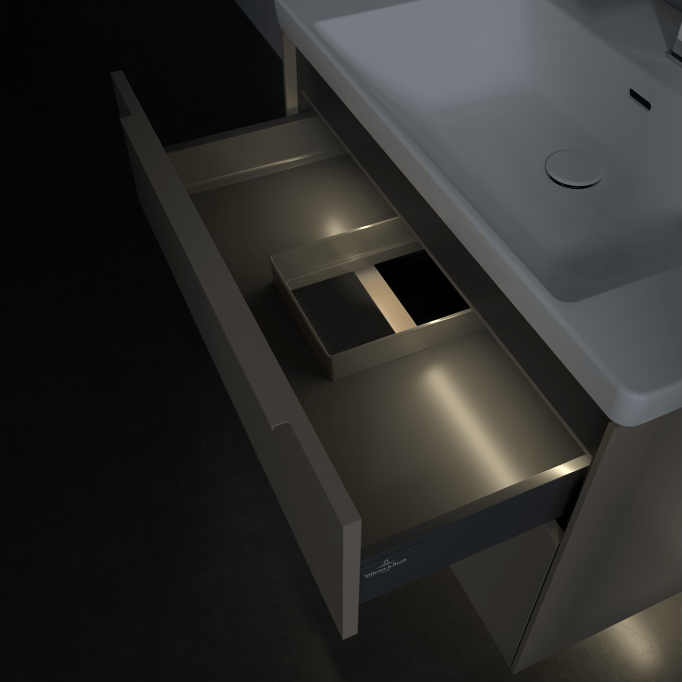 Servantskapet har belyste skuffer med god oppbevaringsplass, og en soft close- og self close-funksjon som sørger for myk lukking, selv når skuffene blir smelt igjen. LED-lyset i skuffen har integrert bevegelsessensor så den automatisk skrur seg på og av når skuffen åpnes og lukkes.