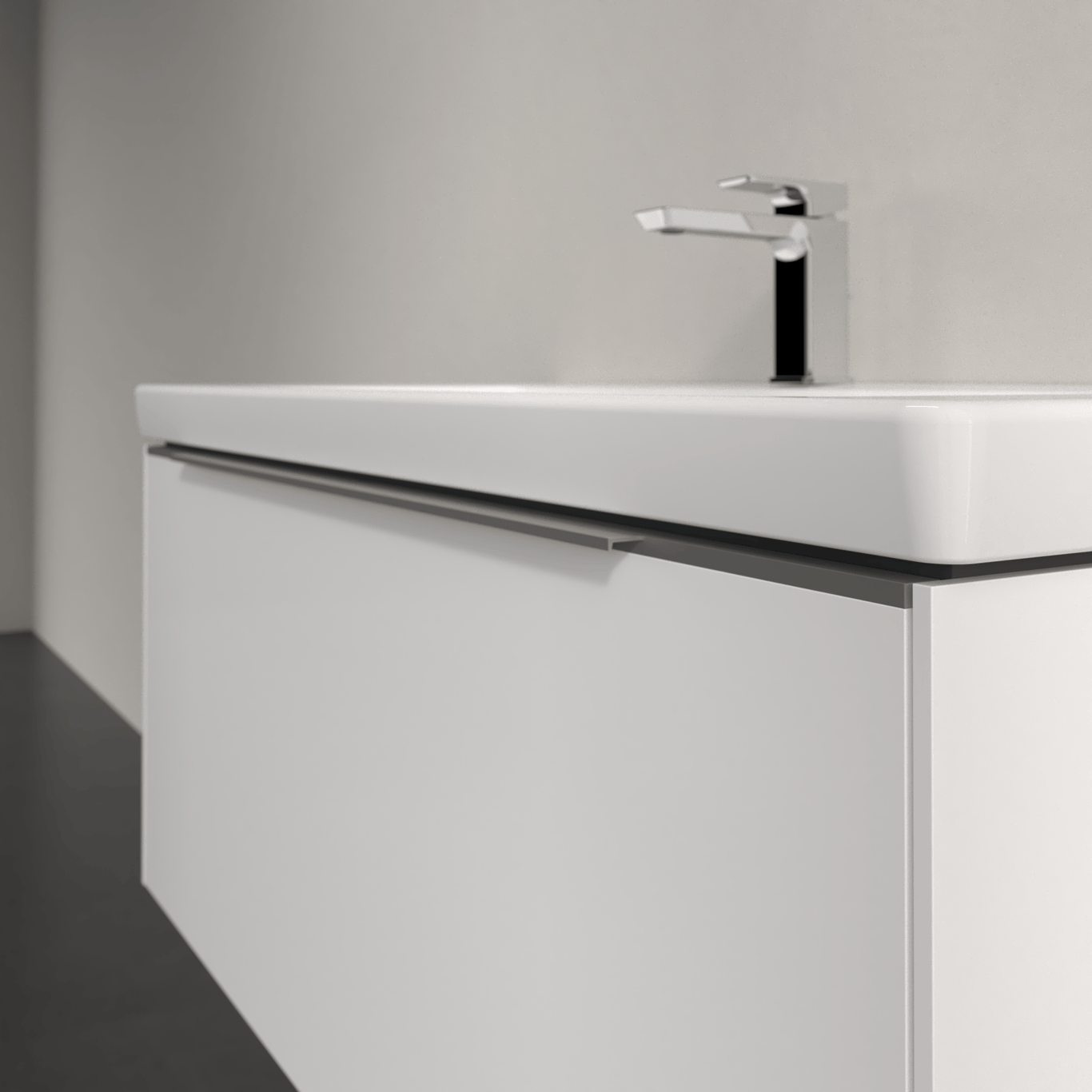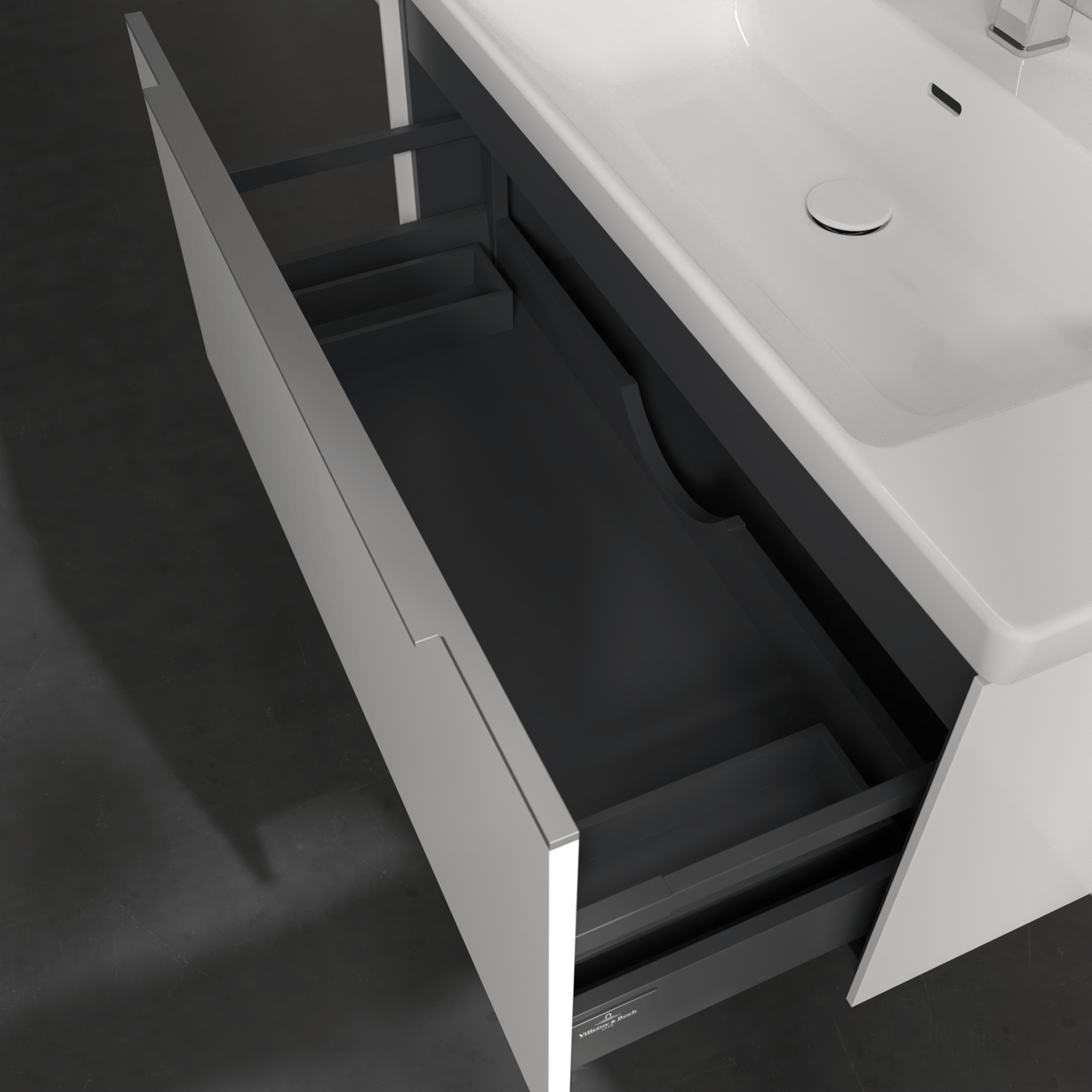 Servantskapet har skuffer med god oppbevaringsplass, og en soft close- og self close-funksjon som sørger for myk lukking, selv når skuffene blir smelt igjen.