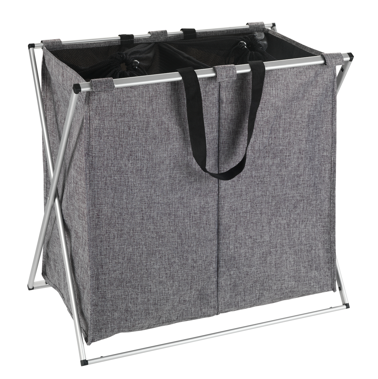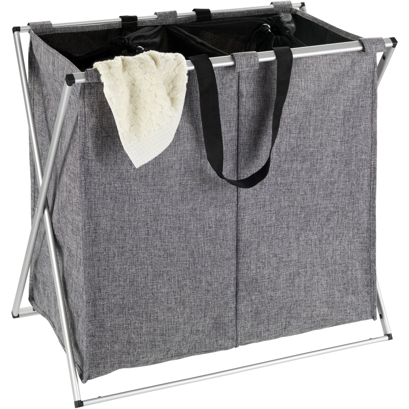 Skittentøyskurv med avtakbart trekk av slitesterkt materiale med solid og ramme. Med håndtak og 2 rom til tøyvask. Rom besparende da den er foldbar.