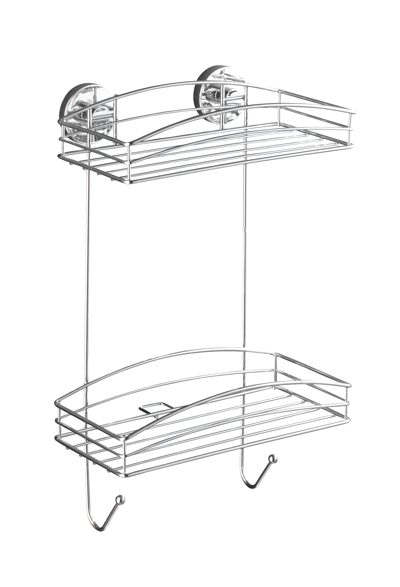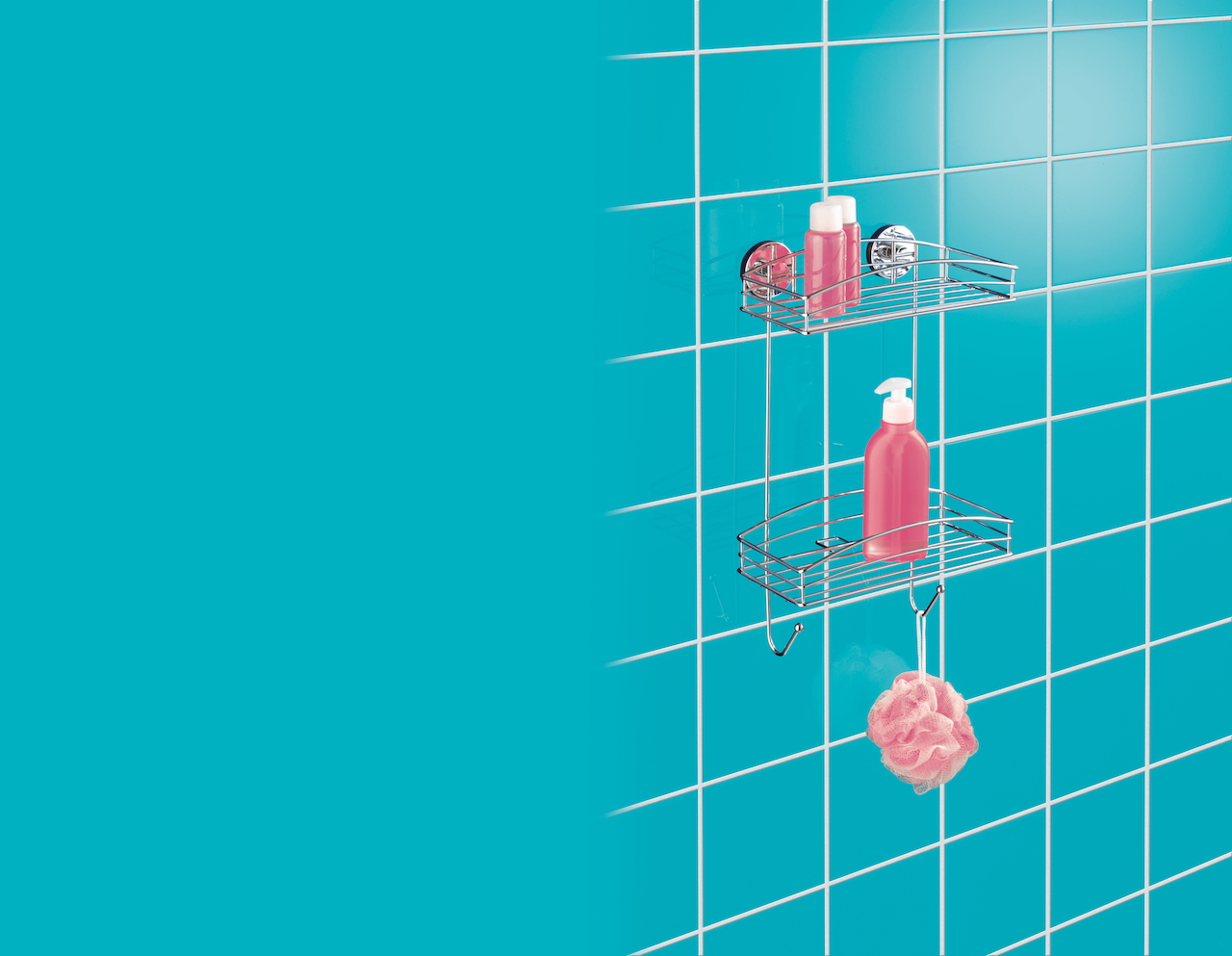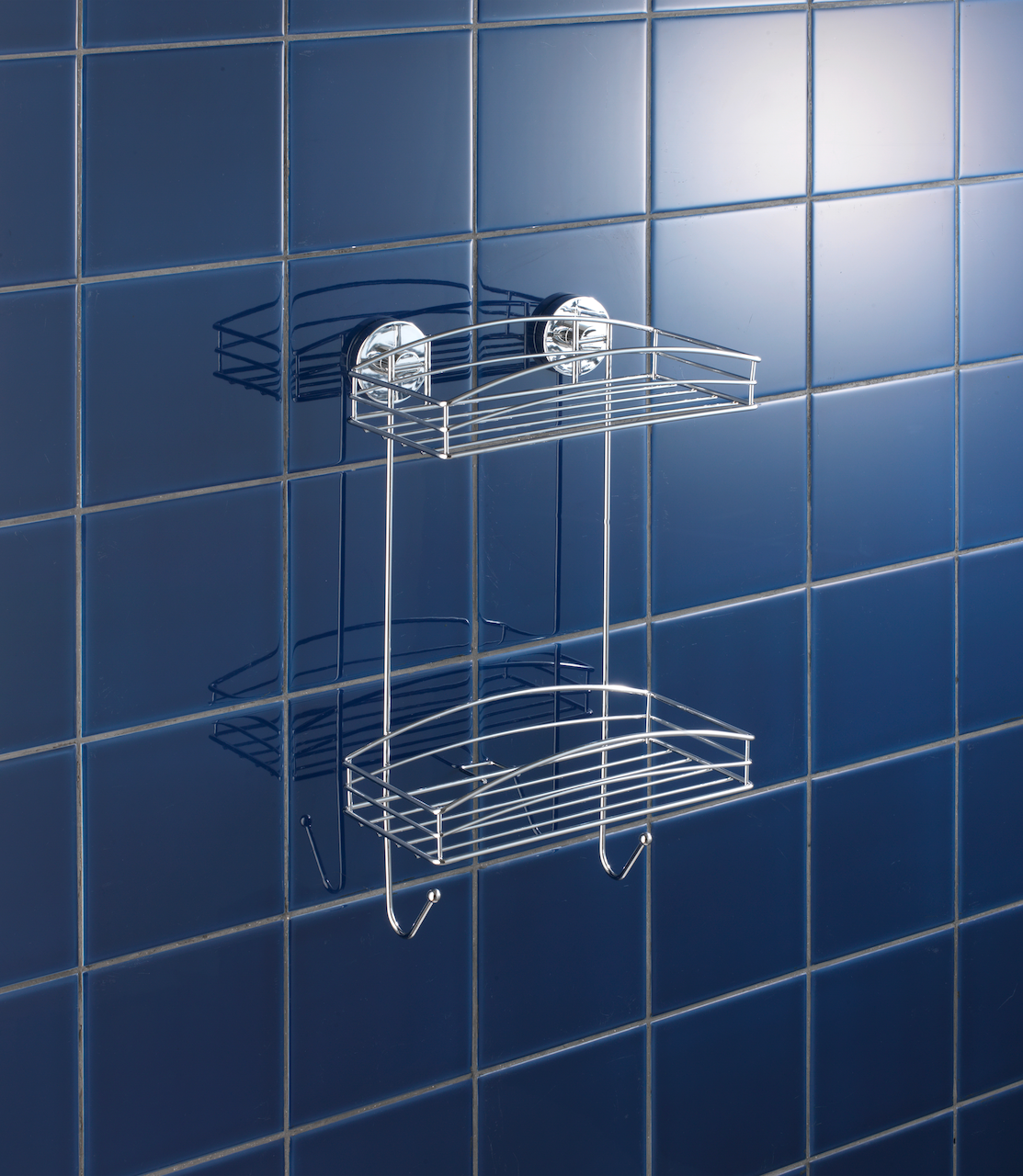 Dusjhylle i krom med super smart system for montering i hjørne uten å etterlate stygge hull på badet